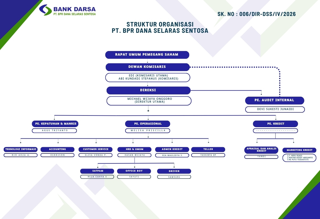 Bank Darsa dijalankan oleh jajaran pengurus berpengalaman dan pemegang saham yang memiliki komitmen kuat untuk mendukung pertumbuhan perbankan daerah yang sehat, aman, dan berkelanjutan.